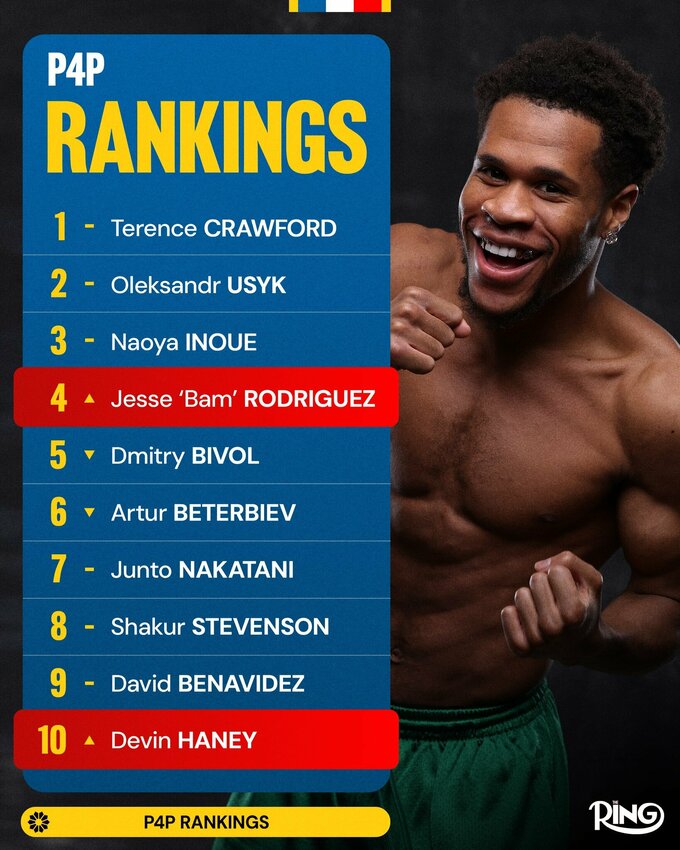 The absolute world champion in the second middleweight Terence Crawford remained the leader of the list. The second position is held by Ukrainian Oleksandr Usyk, owner of the IBF, WBC and WBA belts. Naoya Inoue closes the top three.