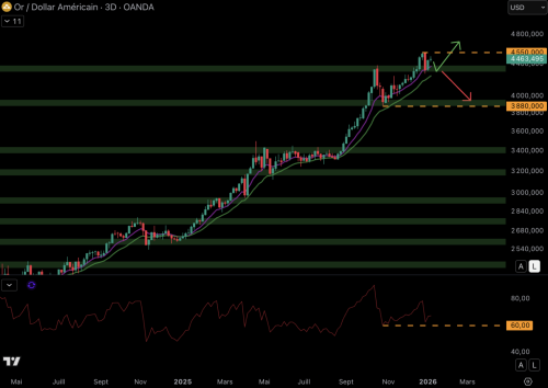 Gold may jump to $5,000 Gold has been showing rising troughs and peaks for several years now. Buyers are in control price, and gold just reached a new historical high of $4550 . As long as buyers protect the moving averages (9-day/18-day EMA), the price has the potential to continue to rise up to $5000 .