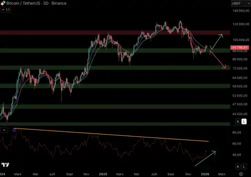 Bitcoin recovers and holds the $90,000 support level At the end of 2025, sellers regained control over the price of Bitcoin. Pressure from sellers has been strong for several weeks, but buyers have been defensive the $90,000 support level . Now the price is trying to break through bearish 9-day and 18-day moving averages (EMA 18) .