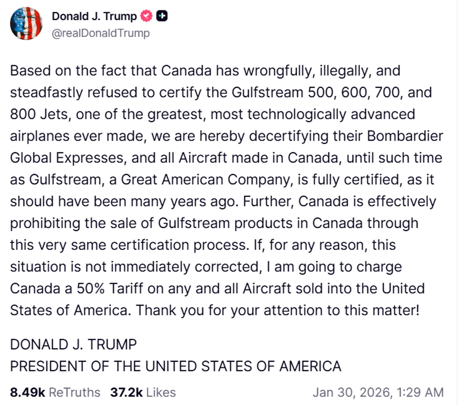 DetailsOn Truth Social, Trump stated that Canadian regulators are blocking American business jets in an attempt to give an advantage to their own manufacturer, Bombardier. In addition to imposing tariffs, the president threatened to completely ban Canadian aircraft from flying in US airspace if Gulfstream certification is not completed immediately.