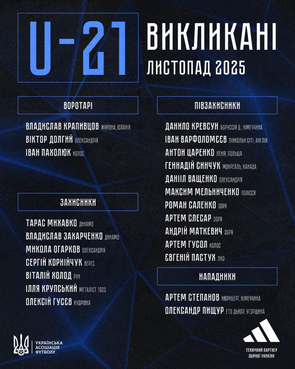 Goalkeepers: Vladyslav Krapyvtsov (Girona, Spain), Viktor Dolgiy (Alexandria), Ivan Pakholiuk (Kolos Kovalivka).