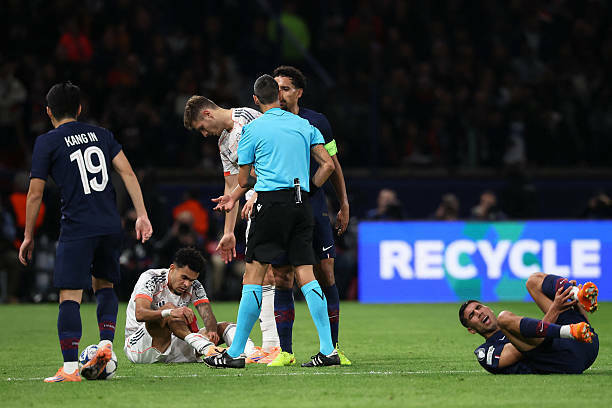 At the end of the first half Ashraf Hakimi at PSG was injured and substituted, while Luis Diaz at Bayern was red-carded for a rough foul.