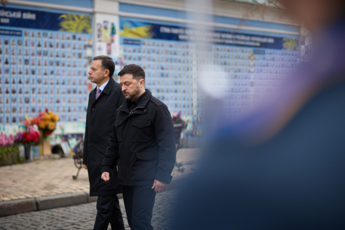 Володимир Зеленський і Луїш Монтенегру пройшли вздовж Стіни памʼяті, що на Михайлівській площі, та віддали шану полеглим воїнам.