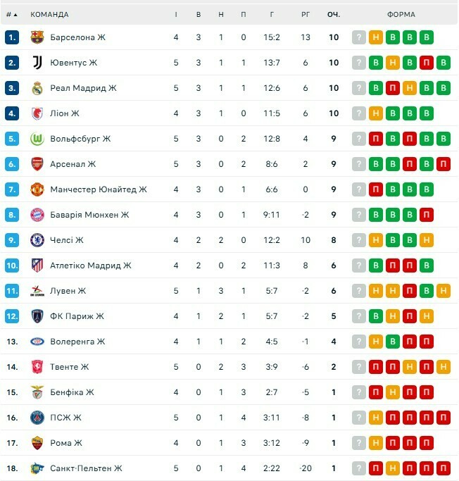 The leaders in the standings are: Barcelona, Juventus, Real, Lyon (10 points), Wolfsburg, Arsenal, Manchester United, Bayern (9), Chelsea (8).