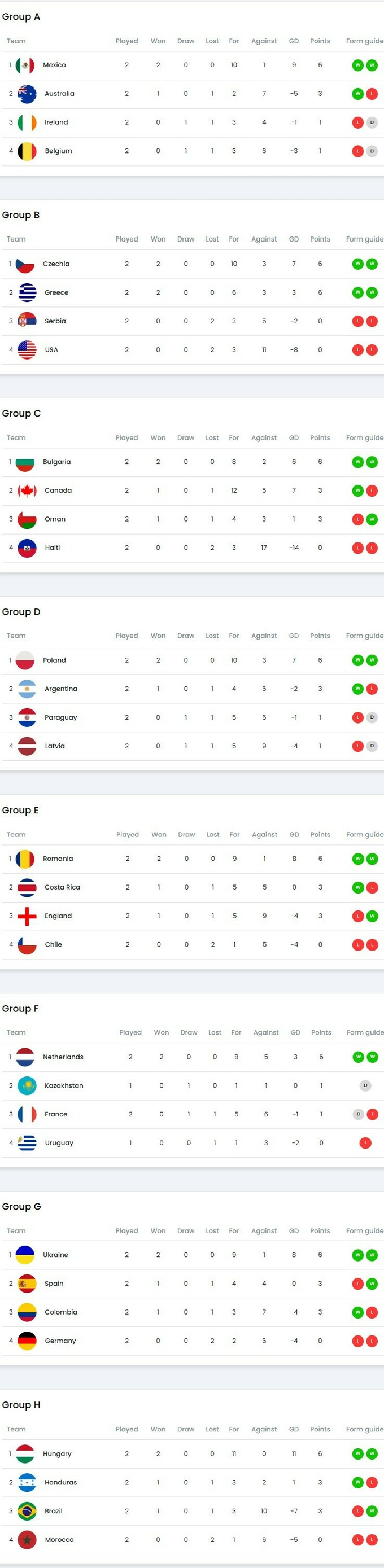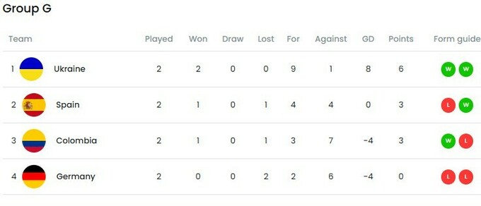 After two rounds, Ukraine leads the group with 6 points, followed by Spain and Colombia (3 each), Germany has no points (0).
