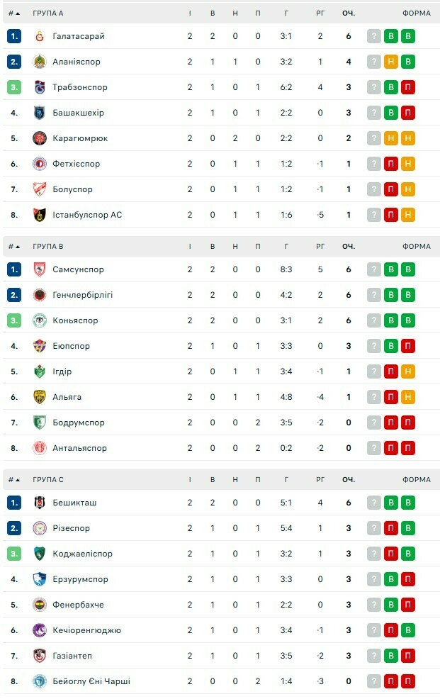 Leading in three groups: Galatasaray, Samsunspor and Besiktas (6 points each), who won two victories each.
