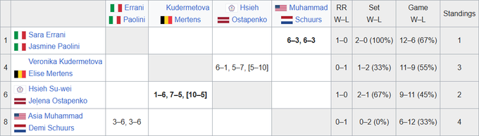 Errani and Paolini dealt with the pair of Muhammad/Shurs in two sets, and Ostapenko and Xie Shuwei took victory from Kudermetova and Mertens in a super tiebreak.