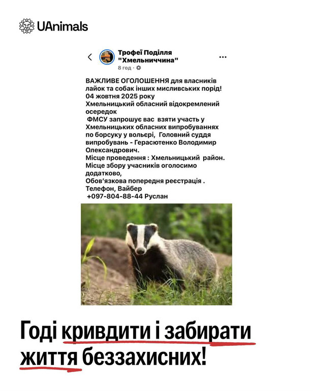 In Khmelnytskyi, hunters announced the so -called “trials for badger” – competitions during which hunting dogs are trained on a living wild animal placed in the aviary.