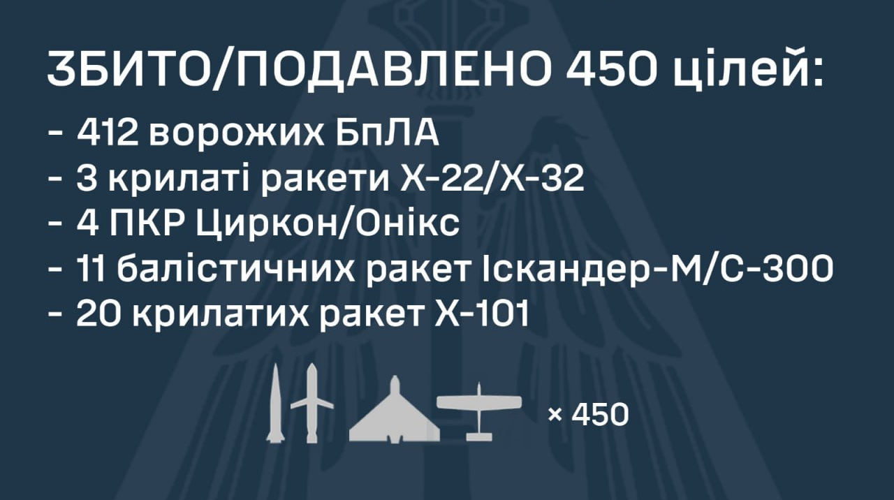 “On the night of February 3, Russia carried out a combined attack on Ukraine using various types of air-launched, ground-based missiles and attack UAVs, the air defense destroyed 450 enemy targets out of 521 launched.”, — write: www.pravda.com.ua