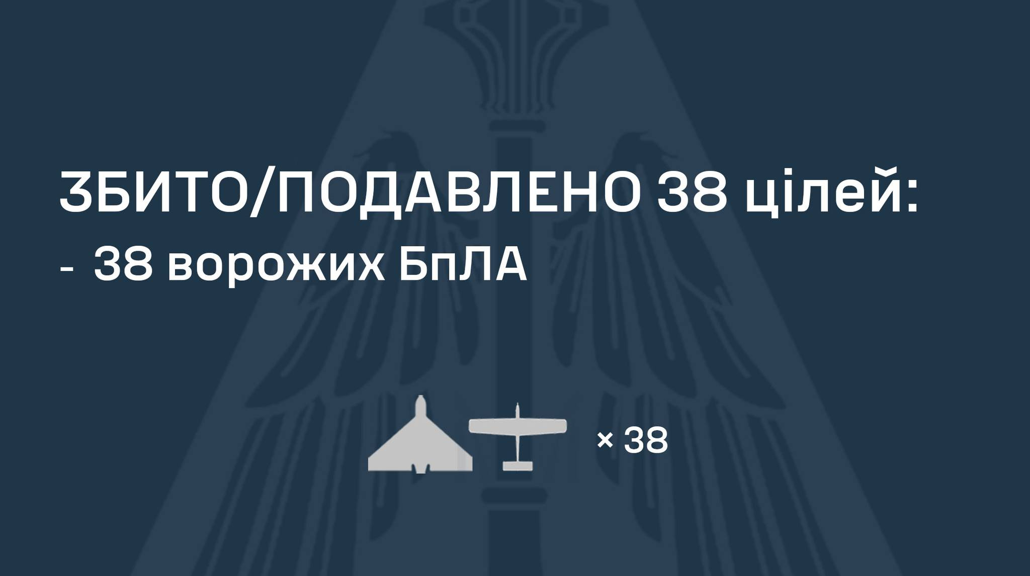 According to preliminary data, as of 09:00, anti-aircraft defense shot down/suppressed 38 enemy drones in the north, south and east of the country.